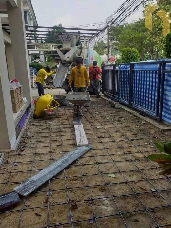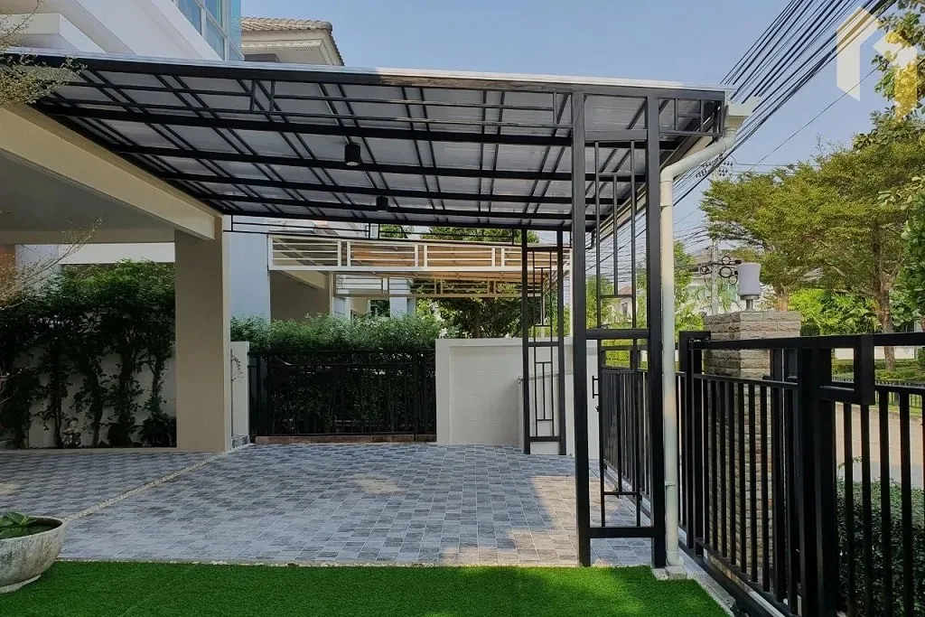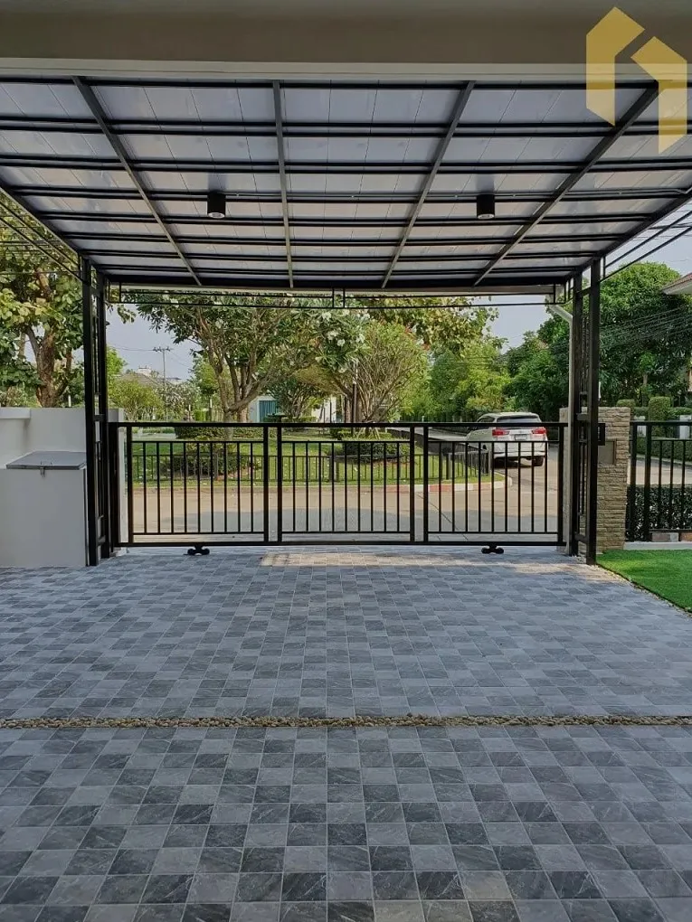 - ติดตั้งเสาเหล็กโชว์ + มุงหลังคาไวนิล และปูกระเบื้องโรงจอดรถ