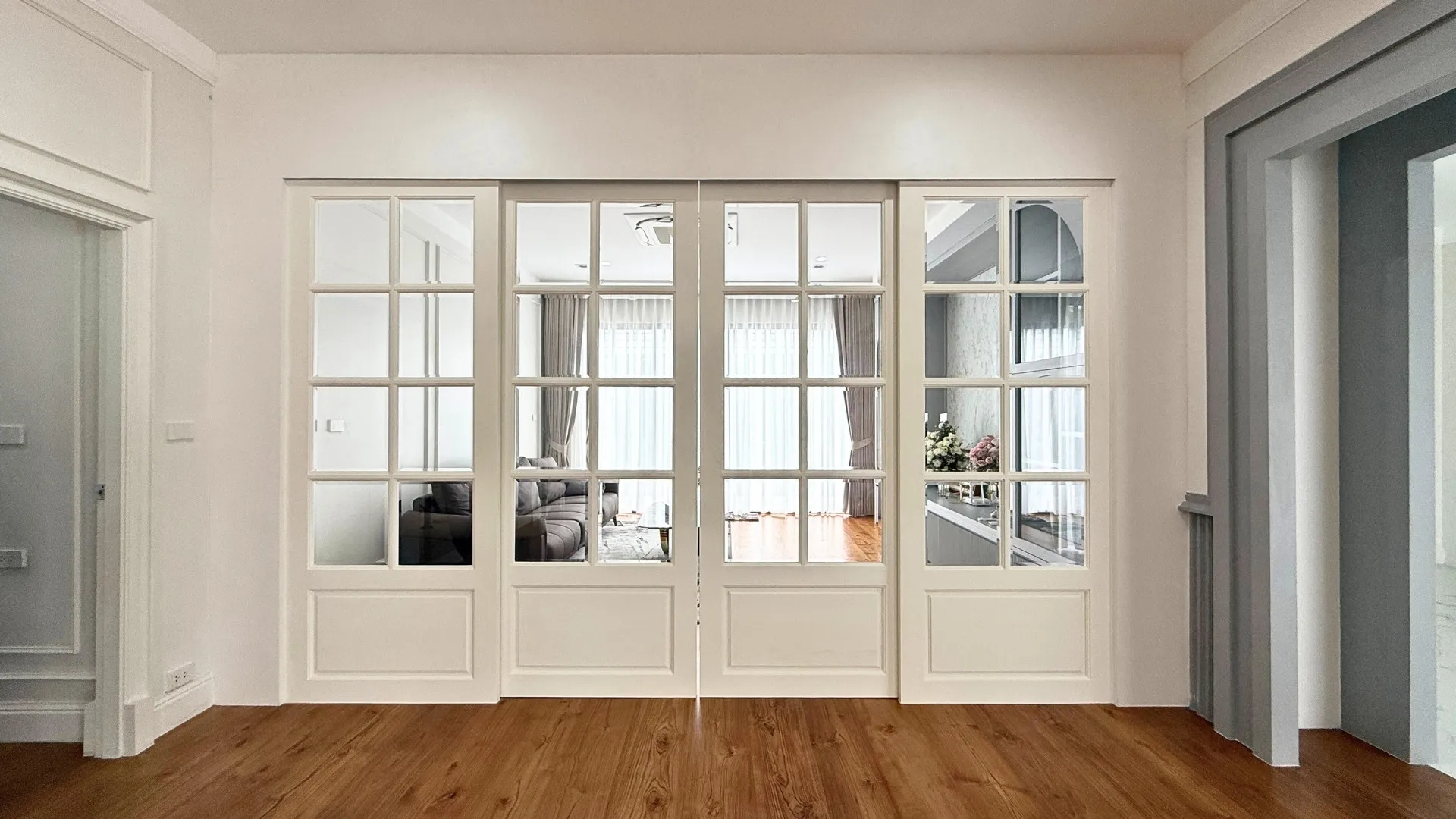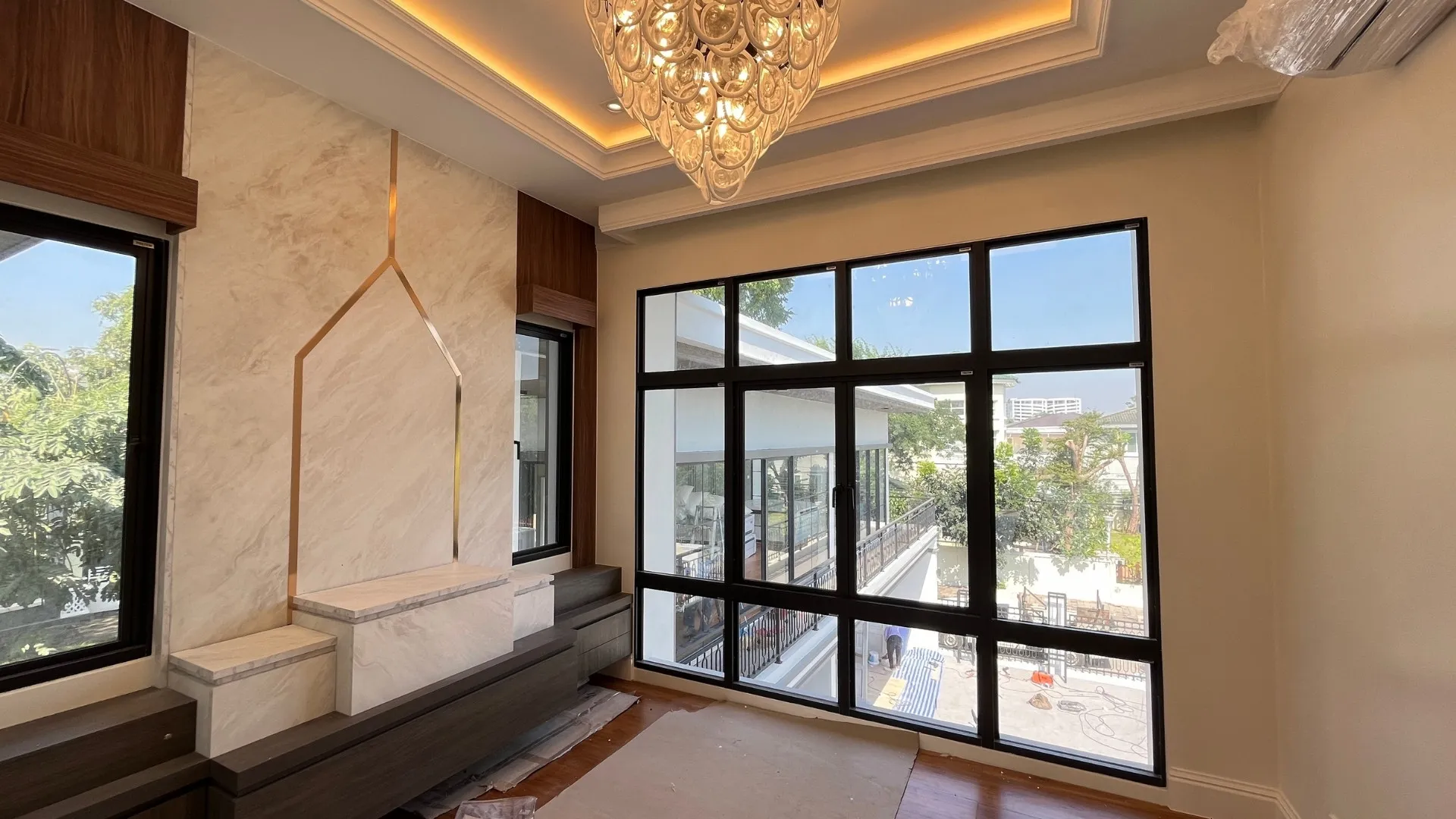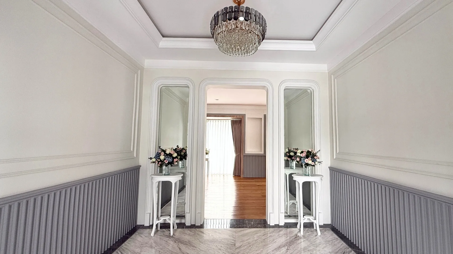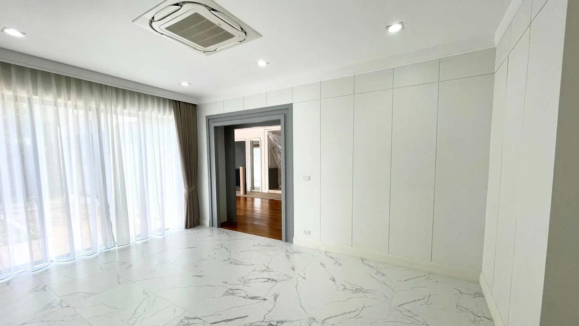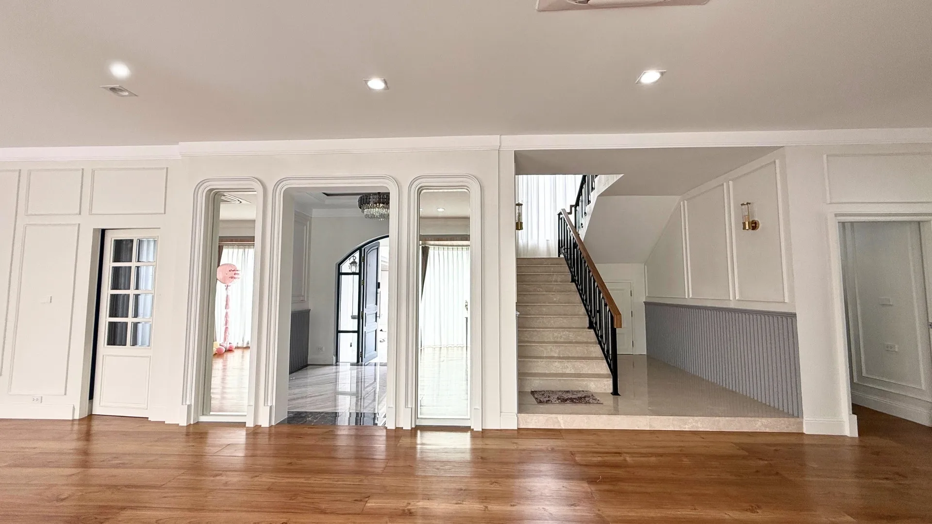 เพื่อให้สัมผัสของการอยู่อาศัยนุ่มนวลและเชื่อมต่อกันอย่างลงตัว เราได้ทำการรื้อพื้นเดิมและปูพื้นใหม่ทั้งหลังครับ โดยเลือกใช้วัสดุเกรดพรีเมียมที่มีลวดลายและโทนสีที่ให้ความรู้สึกหรูหรา คลาสสิก แต่ยังคงความอบอุ่นไว้ ลองจินตนาการถึงการเดินเท้าเปล่าลงบนพื้นสวยๆ ในยามเช้าดูสิครับ… มันคือความรู้สึกที่ช่วยเติมเต็มพลังงานดีๆ ให้กับทุกวันได้อย่างแท้จริง