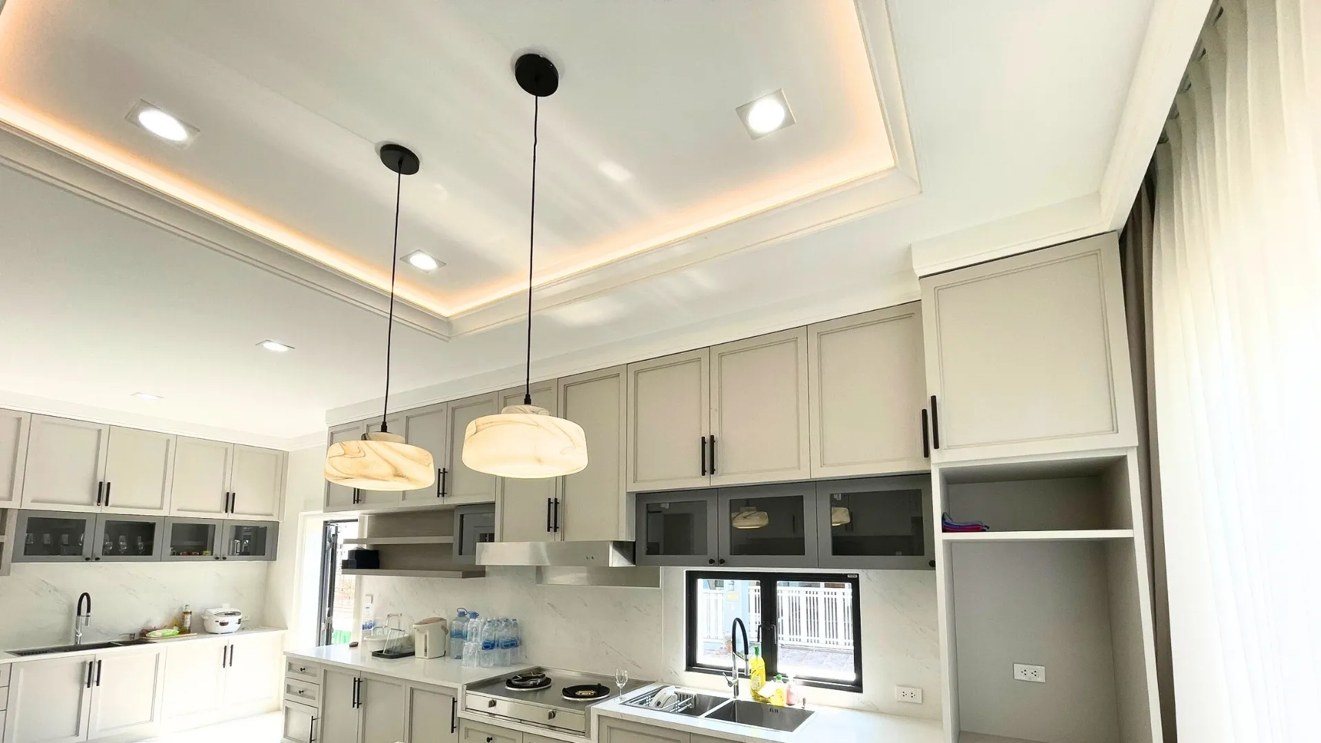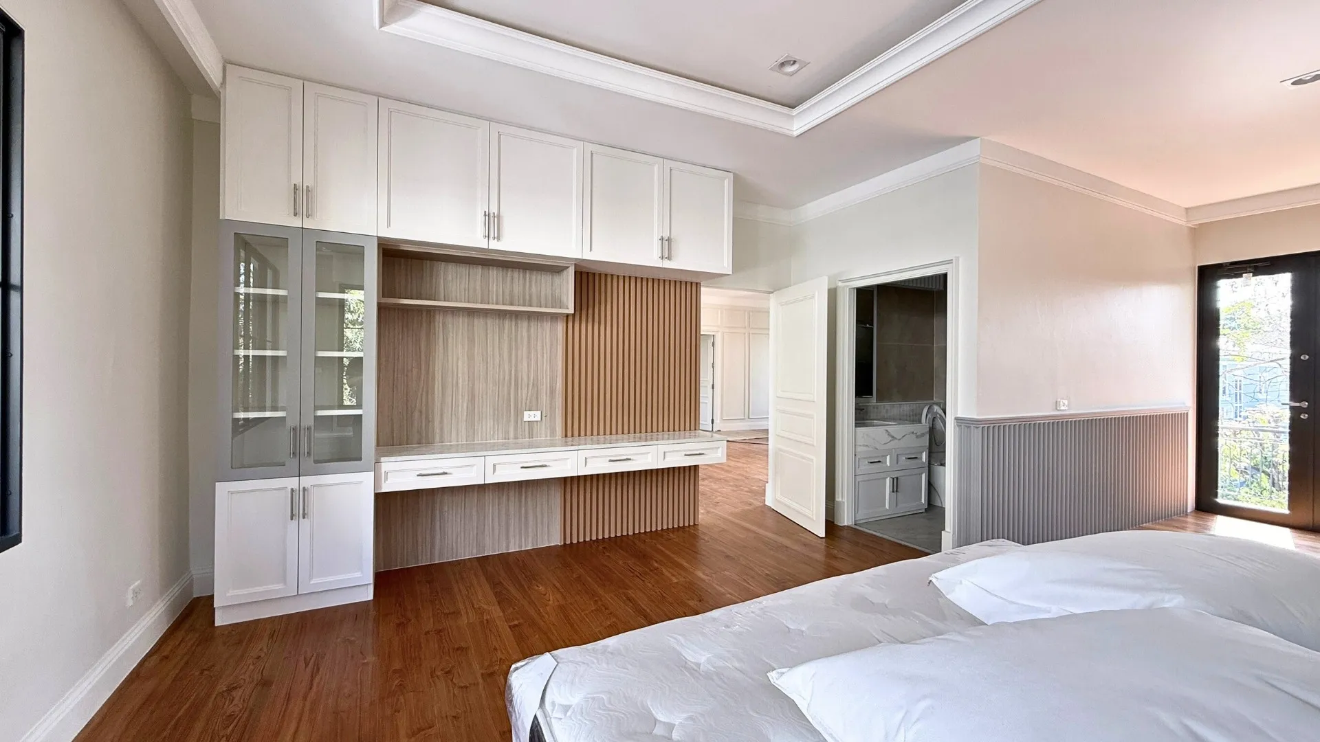นี่คือไฮไลท์สำคัญของบ้านหลังนี้เลยครับ! ทีมงานของเราได้ออกแบบและติดตั้งเฟอร์นิเจอร์ Built-in ใหม่ทั้งหลัง โดยยึดหลัก “สวยงาม หรูหรา และใช้งานได้จริง”