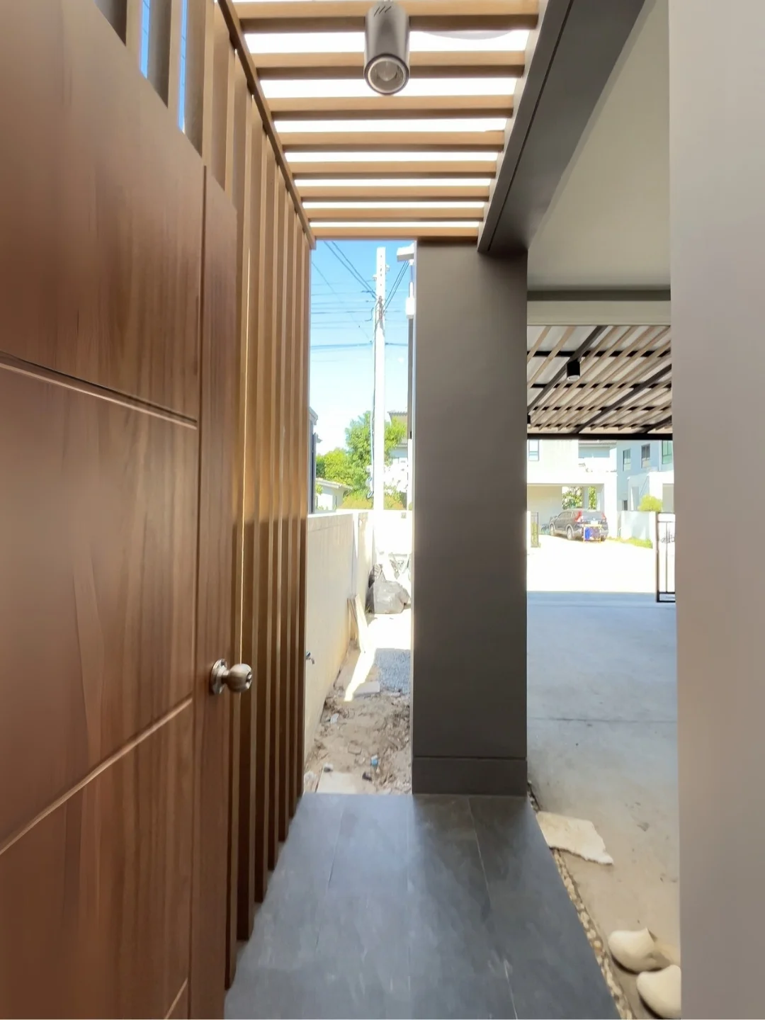 - ต่อเติมหลังคาและออกแบบฝ้าระแนงไม้เทียม พื้นที่จอดรถ พร้อมติดตั้งดวงโคม